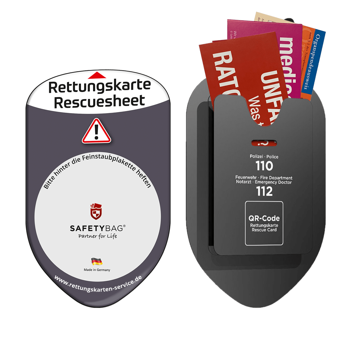 Mit der SafetyBag® S Rettungskarten-Halterung platzieren Sie Ihre Rettungskarte genau dort, wo Rettungskräfte sie sofort finden: an der Frontscheibe hinter der Umweltplakette – der empfohlene Standard in Deutschland.